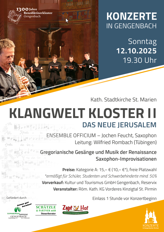 Liebe Freunde der Kirchenmusik, sehr geehrte Gönner unseres Fördervereins, eines der Ziele des Förder- vereins ist, die Konzerte als kulturelle Highlights für möglichst viele Menschen zu einem bezahlbaren Preis anzubieten und auch über Gengenbach hinaus Musikbegeisterte anzusprechen. Wegen des hochklassigen Künstlerspektrums kann ....